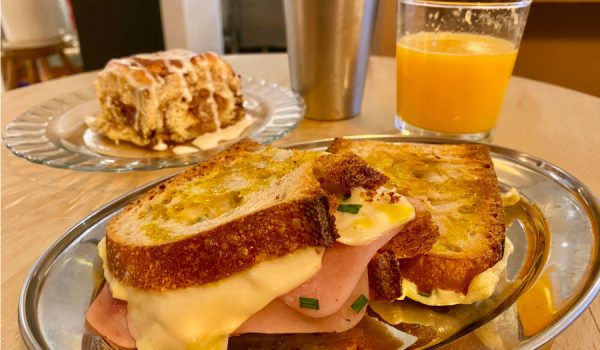 La mia scelta: sandwich misto con prosciutto e formaggio, girella alla cannella e spremuta d’arancia.